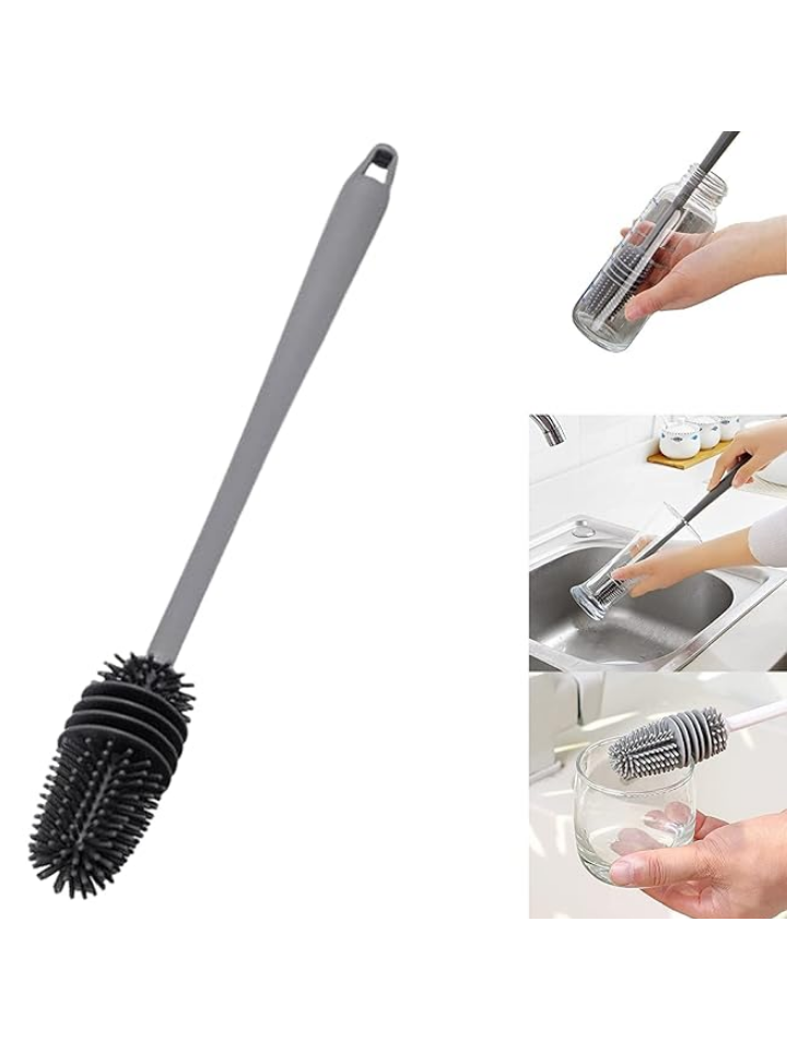 The silicone brush head is soft and does not scratch the container. The bristles are flexible and tough, do not fall off, break and can be used for a long time.The design of the hanging holes at the bottom of the handle can be hung to dry. This is convenient for storage and saves spaceThe bottle brush is temperature resistant and can be sterilized in boiling water. Easy to clean, does not absorb water, rinses with tap, cleans and drains quickly.Included Component: 1 x Silicone Bottle Cleaning Brush. Size- 33cm Long